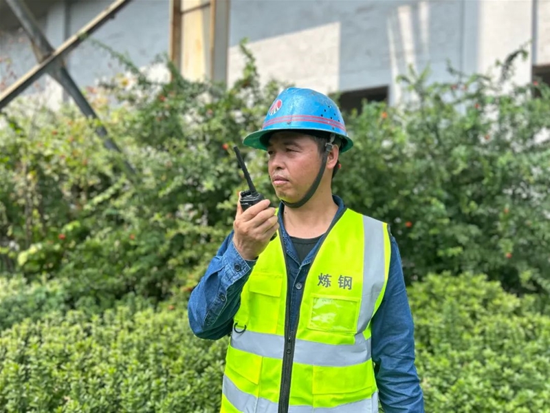 在煉鋼新區(qū)三次除塵檢修現(xiàn)場,班長許建峰頭戴安全帽,身著反光背心,目光如炬,揮汗如雨,正指揮著吊車卸載電氣柜,高空中太陽360度無死角直射,他全然不顧,忙得不亦樂乎。