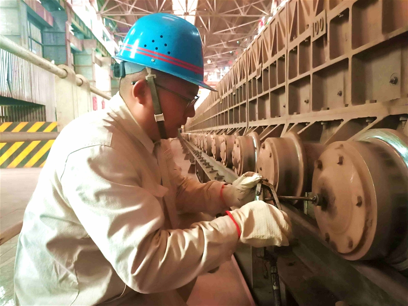 臺(tái)車軌道旁,臺(tái)車工薛峰虎正在對(duì)臺(tái)車滾輪區(qū)域設(shè)備進(jìn)行潤(rùn)滑保養(yǎng),129個(gè)臺(tái)車見證了他日復(fù)一日的堅(jiān)守,50℃的高溫環(huán)境“烤”驗(yàn)著他,擺動(dòng)帶、寬皮帶、燒結(jié)機(jī)、臺(tái)車小格……見證了他矢志不渝奮斗的青春足跡。