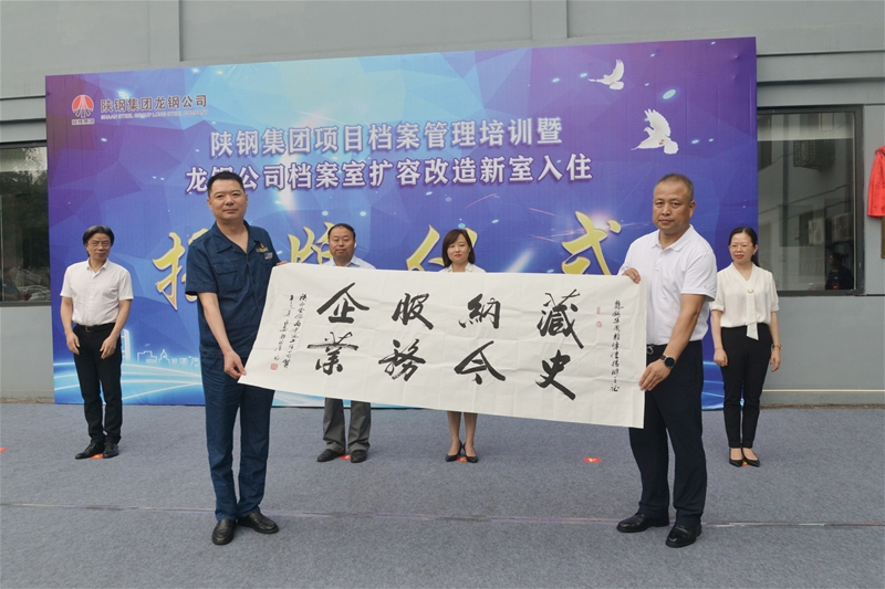 項(xiàng)目施工方陜西金銀島建筑工程有限公司贈予龍鋼公司檔案室 “藏史納今,服務(wù)企業(yè)”的題字。