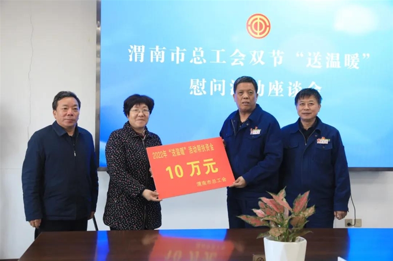 1月18日,渭南市總工會黨組書記、常務(wù)副主席侯雪靜,韓城市總工會常務(wù)副主席李養(yǎng)義一行來公司“送溫暖”,并召開座談會。公司黨委副書記、總經(jīng)理李都宏,黨委委員、工會主席趙春棠,各基層工會主席、相關(guān)部門負(fù)責(zé)同志參會。
