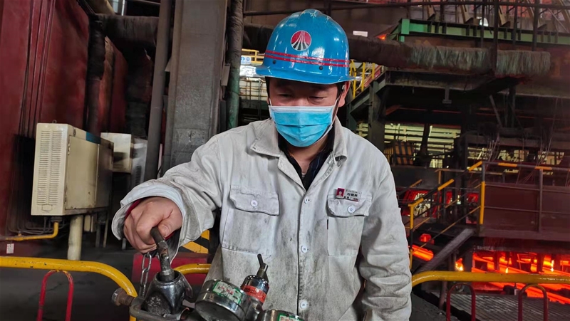 為確保鑄坯質量,每隔五個小時需要進行一次換套管。張光輝穿著防護服,手拿拖圈直奔三流。中包工王曉輝精心關注著三流鋼水,配合張光輝完成更換套管工作。小強協(xié)助壓著配重,張光輝迅速將拖圈套入套管,并將套管卸下放置到廢鋼斗內。這只是他們工作的其中一項,但不管是白天還是黑夜,他們始終以飽滿的工作熱情去完成每一次任務。