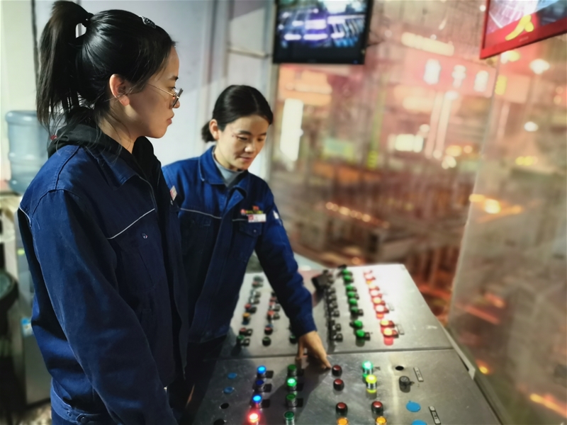 推鋼工們雖然年齡不一、性格各異,但她們都有一個(gè)共同的特征,那就是不怕苦、不服輸。推鋼崗位就像大浪淘沙,最開始時(shí),許多分配到推鋼崗位的女工都受不了高溫環(huán)境和高強(qiáng)度的工作,紛紛調(diào)離,但是這些推鋼工卻在大浪中乘風(fēng)破浪,戰(zhàn)勝種種困難,始終堅(jiān)守在火熱的崗位。她們不僅要正確操作推鋼機(jī)、撈鋼機(jī)、輥道以及熱送設(shè)備,還要高度警惕推鋼機(jī)掉道、鋼坯不切割等異常情況。她們用女性特有的專心、細(xì)心、責(zé)任心,撐起了連鑄安全生產(chǎn)的“半邊天”。