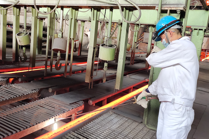 在4#連鑄機(jī)臺(tái)下,兩名拉矯剪切工正在輥道旁切割三流的連角,切割人員一手拿著割槍,一手半遮住面部,在鋼坯的炙烤下他們額頭上滲出汗水,但他們卻沒有一絲動(dòng)搖,依然雙目不移,緊緊握著割槍切割,認(rèn)真而謹(jǐn)慎,在火花飛濺中快速且標(biāo)準(zhǔn)地將連角切斷,只為確保割縫在標(biāo)準(zhǔn)范圍內(nèi),降低消耗。剛切割完鑄坯的他們顧不上額頭上的汗水,走向定尺桿的位置,抬起定尺桿,三步并作兩步跨越輥道,對(duì)溫度最高的中間流紅坯進(jìn)行長度測(cè)量,動(dòng)作統(tǒng)一、干脆利落。為了保證鑄坯的定尺合格率達(dá)到100%,像這樣的場景一班下來需要重復(fù)五六次,但,他們卻沒有任何怨言,默默堅(jiān)守在自己的崗位,為降本增效做出自己的貢獻(xiàn)。