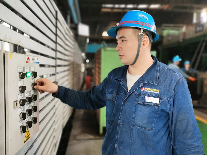 隨著氣溫逐漸升高,生產(chǎn)線就像蒸籠一般,溫度不言而喻,即使經(jīng)受高溫的炙烤,但加熱爐工長梁磊仍堅守在生產(chǎn)現(xiàn)場。早上8:00,他和往常一樣了解完夜班生產(chǎn)情況后,準(zhǔn)備對煤氣區(qū)域點檢情況進(jìn)行復(fù)查,只見他查驗煤氣檢測儀、檢查大學(xué)生劉思超勞保穿戴規(guī)范后,兩人一起來到加熱爐平臺查看設(shè)備運轉(zhuǎn)情況、檢測煤氣濃度。一邊檢測一邊給劉思超講解加熱爐工藝操作和原理,時不時看看劉思超所記錄的知識點是否正確。隨后,兩人又來到加熱爐風(fēng)機房查看設(shè)備運轉(zhuǎn)狀況,一圈轉(zhuǎn)下來,他們滿頭大汗,稍微擦拭后,便返回操作臺對檢查情況進(jìn)行總結(jié),他們用敬業(yè)完成這份“高烤”測試考卷,以扎實的專業(yè)基礎(chǔ)知識迎接未知的“大考”。