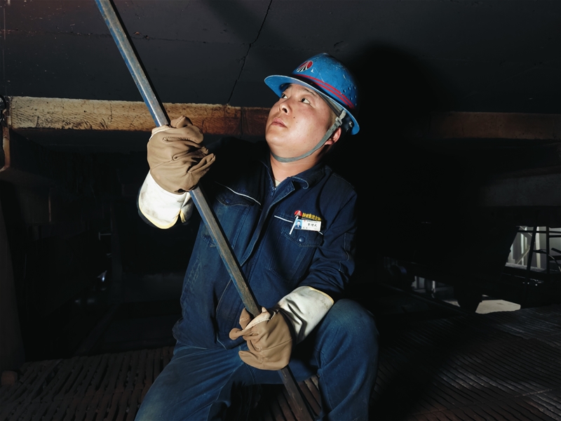 還未完全冷卻的爐膛就像一個(gè)大烤爐。賈增武佩戴好煤氣報(bào)警器,對爐內(nèi)煤氣濃度進(jìn)行檢測達(dá)標(biāo)后,拿起制作好的工具,直接進(jìn)入爐膛內(nèi),找準(zhǔn)位置,上下發(fā)力,頑固的結(jié)瘤一塊塊被敲落下來。同樣的動(dòng)作,在不停地反復(fù)進(jìn)行著,看似簡單,其實(shí)要消耗大量體力。不一會(huì)兒,豆瓣大的汗水順著他的臉頰滴落在尚有余溫的臺(tái)車上被瞬間蒸發(fā)……面對高溫他們迎難而上、緊密協(xié)作,最終提前兩個(gè)小時(shí)完成燒嘴清理工作。
