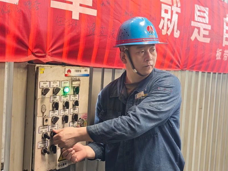 上午8:10,激烈而緊張的換輥“競賽”正式開始,只見“參賽者”的身影穿梭在現(xiàn)場,仿佛4×100游泳接力賽場上你追我趕的運(yùn)動(dòng)員。軋鋼工緊密協(xié)作,動(dòng)作嫻熟,每一個(gè)步驟都精準(zhǔn)無誤。王煜和范宇坤負(fù)責(zé)拆卸舊輥,并配合天車工將需要更換的軋輥慢慢從軋機(jī)中抽出來,放置在下線軋輥指定地點(diǎn)。李陽和楊延博配合默契,負(fù)責(zé)吊運(yùn)新輥以及安裝調(diào)試工作,只見一人負(fù)責(zé)操作箱操作,一人根據(jù)其指示小心翼翼地操作按鈕,調(diào)試后再仔細(xì)檢查,確保導(dǎo)衛(wèi)和除塵水管完好無損。精軋班長蓋俊生則負(fù)責(zé)檢查換輥質(zhì)量,整個(gè)過程每一個(gè)人都恪盡職守、全力以赴,每一個(gè)環(huán)節(jié)都如同接力賽中的一棒,傳遞著責(zé)任與使命。