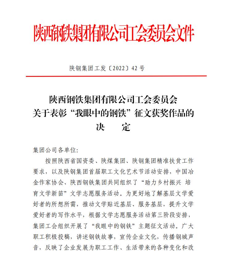 近日,從陜鋼集團工會《關于表彰“我眼中的鋼鐵”主題征文獲獎作品的決定》文件獲悉,龍鋼公司6篇征文獲獎。