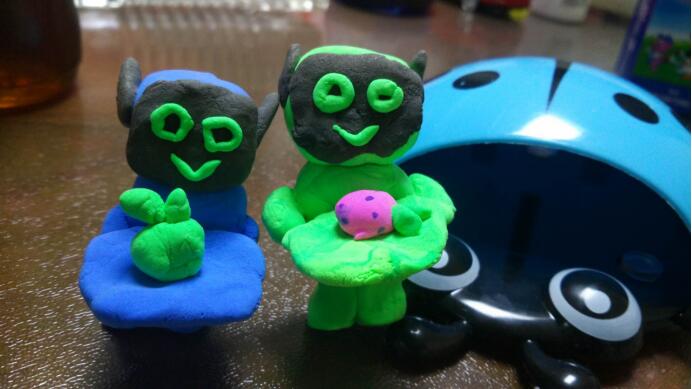 妮子的手很巧,一盒橡皮泥在她的手里像施了魔法似的千變?nèi)f化,想要什么就捏什么:有七彩虹,有美味的心形蛋糕,有漂亮的蝴蝶仙子,有吃著胡蘿卜的兔子,有躺在嬰兒車?yán)锏男雰海刑自谑种干系拇蠡ㄖ腑h(huán),有掛在脖子上的漂亮吊墜,有小茶壺和小茶杯。旸程喜歡機(jī)器人,她就在手機(jī)上看了一眼,不一會(huì)功夫就捏出來了:藍(lán)色的身子,方形的頭,圓圓的眼睛,尖尖的耳朵,手里還托著個(gè)盤子,是專門送水或者送別的東西用的,竟和手機(jī)上的機(jī)器人相差無幾。旸程直夸“真不錯(cuò),真像,姐姐真棒!”再一會(huì)功夫,妮子又捏出了另一個(gè)機(jī)器人,倆人學(xué)機(jī)器人走路,學(xué)機(jī)器人對(duì)話,玩得不亦樂乎。